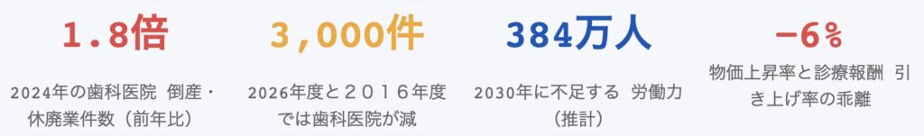 • 倒産ラッシュの到来:2024年の歯科医院の倒産・休廃業件数は前年比1.8倍に急増。2016年度比で、2026年度までに約3,000件の医院が廃止。